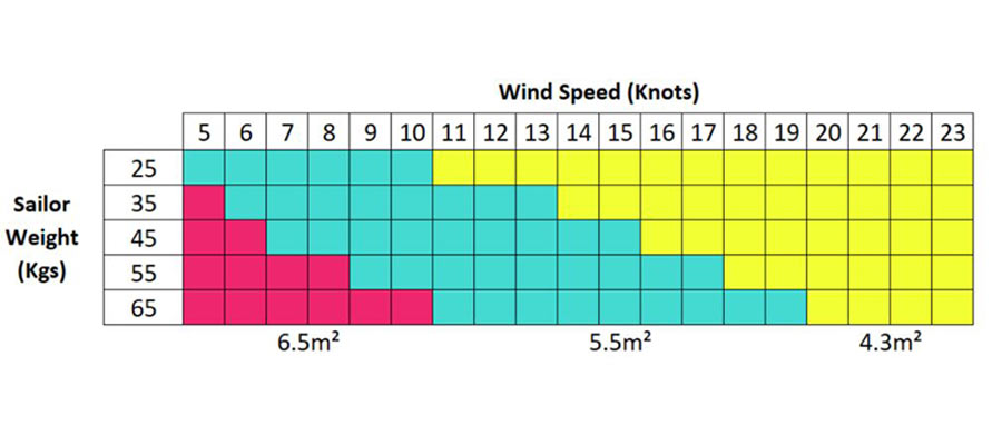 This chart is only an indication of what is best for an average sailor in flat water conditions. More experienced sailors may choose to use larger rigs in windier conditions.