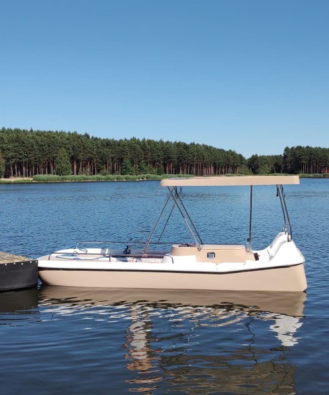 Propulsion is provided by a fixed 650 W electric outboard motor, controlled via a dedicated throttle unit. The motor remains in a fixed position, while steering is handled by a traditional tiller, ensuring simple and reliable operation.