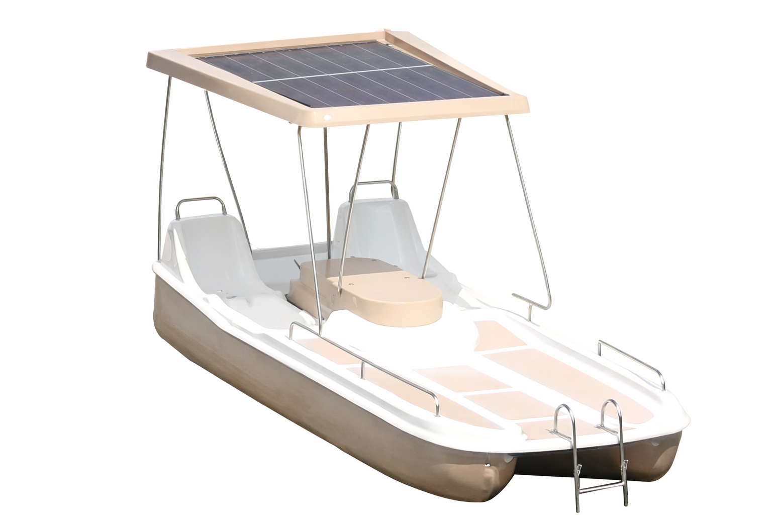 The boat is fitted with a rigid fibreglass roof incorporating a high-performance solar panel delivering between 450 and 480 W of power. This energy output directly supplies the electrical system and recharges the batteries during use or when the boat is stationary. A Victron charger ensures intelligent energy management and optimised charging.