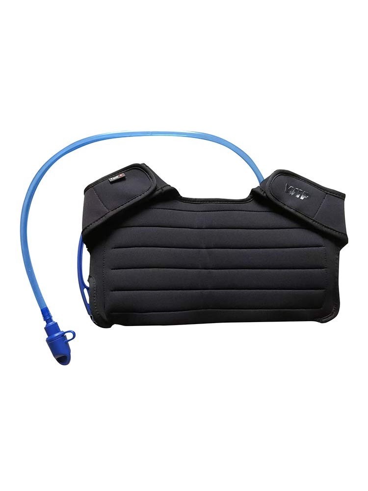 La housse en néoprène protège la poche à eau, tandis que le tuyau d’hydratation passe discrètement par la sangle d’épaule jusqu’à la poche avant du gilet (PFD).