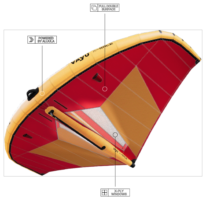 Dotée d’une aile à double surface 100 %, la VAYU X-Race V2 offre un profil efficace et à faible traînée, idéal pour un VMG (Velocity Made Good) optimal au près et des vitesses de pointe élevées.