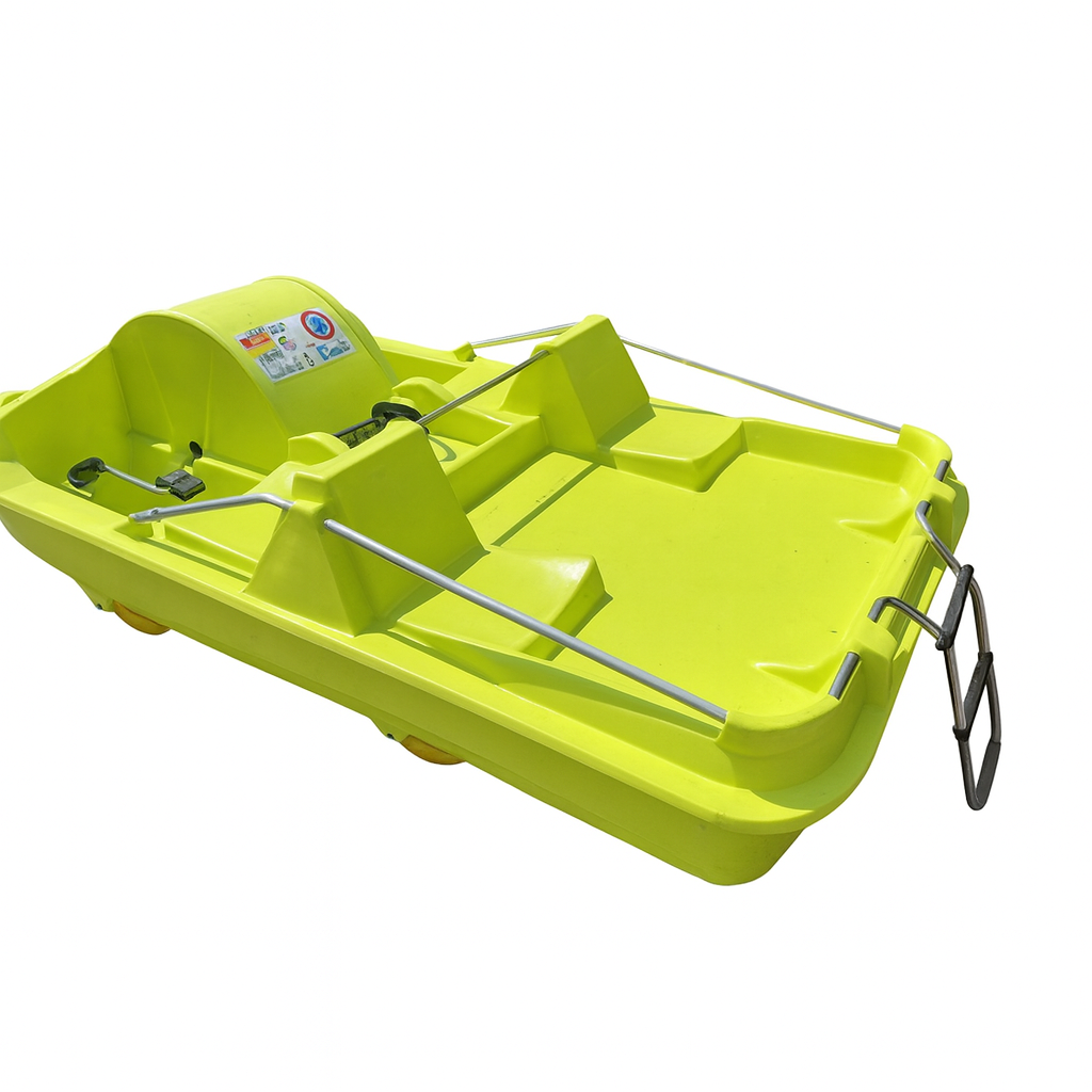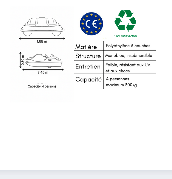 Le pédalo P4P est un modèle robuste et insubmersible conçu pour accueillir jusqu’à quatre personnes. Fabriqué en polyéthylène haute densité 3 couches, il offre une excellente résistance aux chocs et aux UV. Son design stable, ses sièges ergonomiques et son toboggan optionnel en font un choix idéal pour les bases nautiques, les plages ou les lacs. Simple à entretenir et très durable, il convient parfaitement à un usage professionnel comme privé.