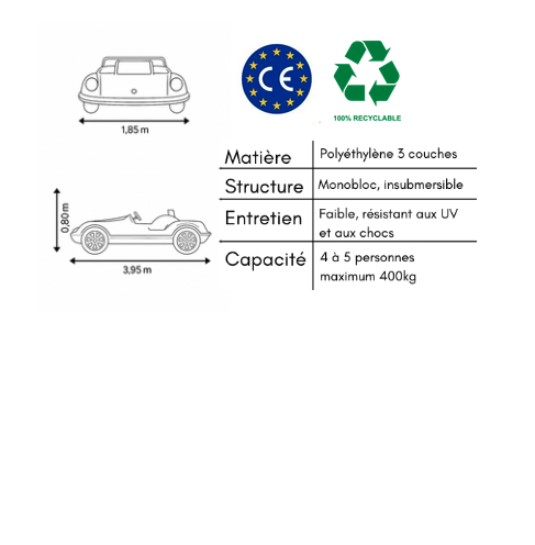 Le HydroFerrari de La Noria est un pédalo haut de gamme conçu pour offrir à la fois performance, esthétique et sécurité. Avec son design unique rappelant les lignes d’une voiture sportive, il attire immédiatement l'œil et constitue un véritable atout pour les professionnels du loisir comme pour les particuliers recherchant un produit différenciant. Sa coque en polyéthylène rotomoulé 3 couches garantit une excellente résistance aux chocs, aux UV et à l’eau salée, assurant une longévité remarquable même dans un contexte d’utilisation intensive. Le pédalo est équipé d’un toboggan en option et d’une échelle en inox, permettant des entrées et sorties de l’eau faciles et amusantes. Son aménagement intérieur, ergonomique et spacieux, assure un confort optimal pour 4 à 5 personnes. Stable, maniable et très ludique, le HydroFerrari est le choix parfait pour proposer une activité nautique attractive, sûre et durable.