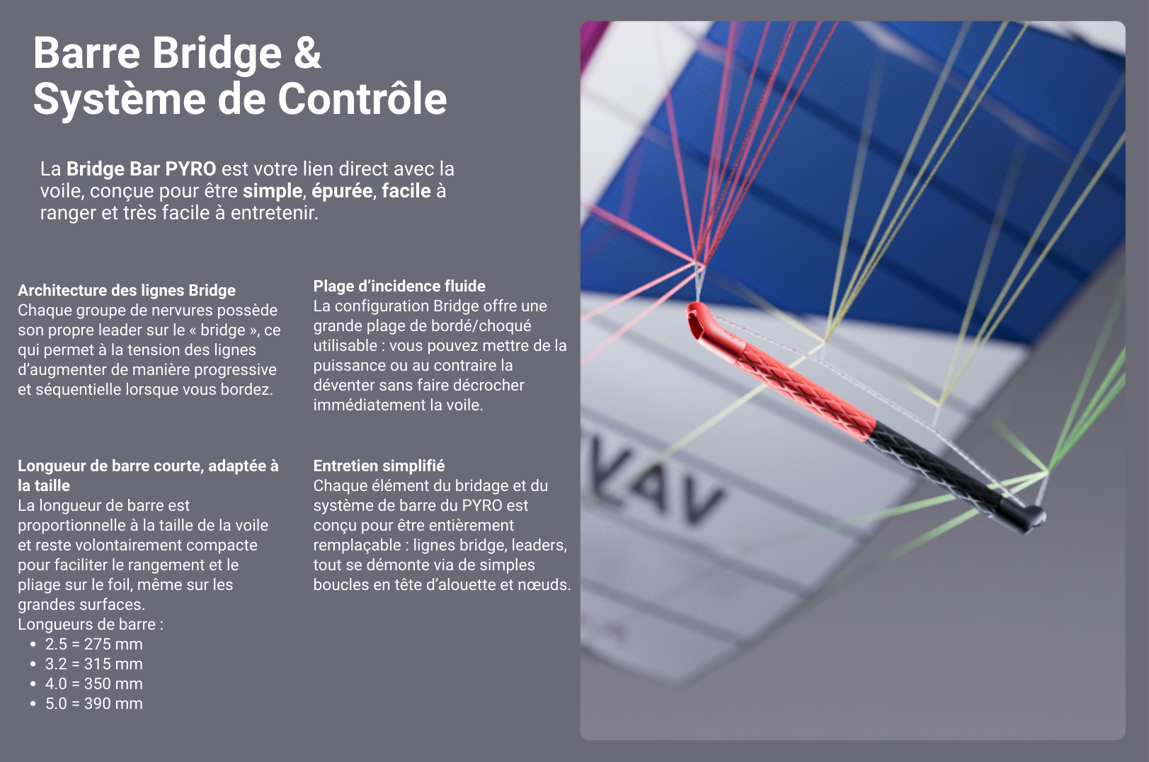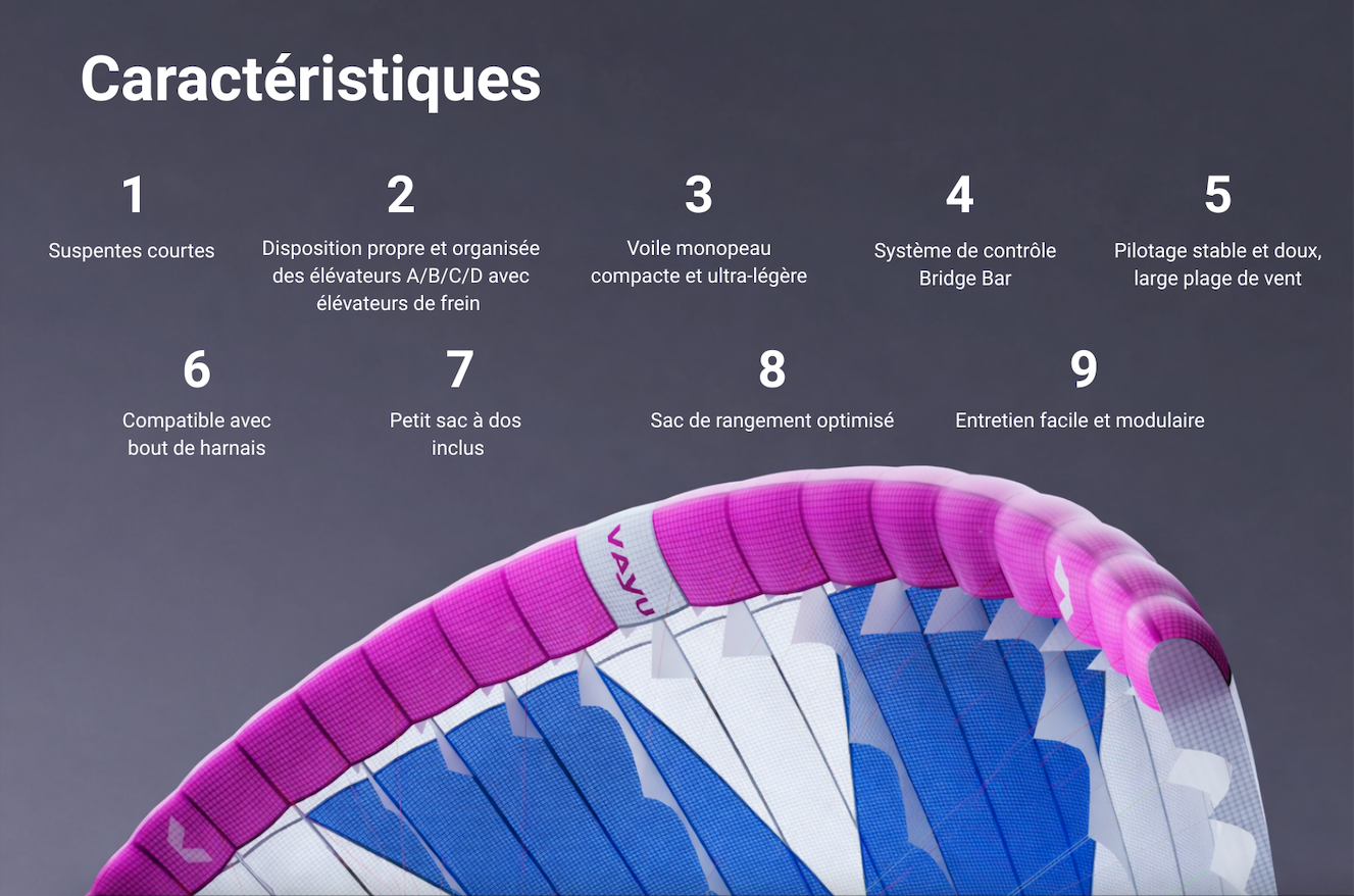 Le VAYU PYRO est en développement depuis plus d’un an et représente ce qui se fait de plus récent en matière de technologie Parawing. Sa forme de voile et son allongement modéré sont optimisés pour offrir une réelle capacité à remonter au vent, de la puissance, ainsi qu’un pilotage calme, prévisible et contrôlé.