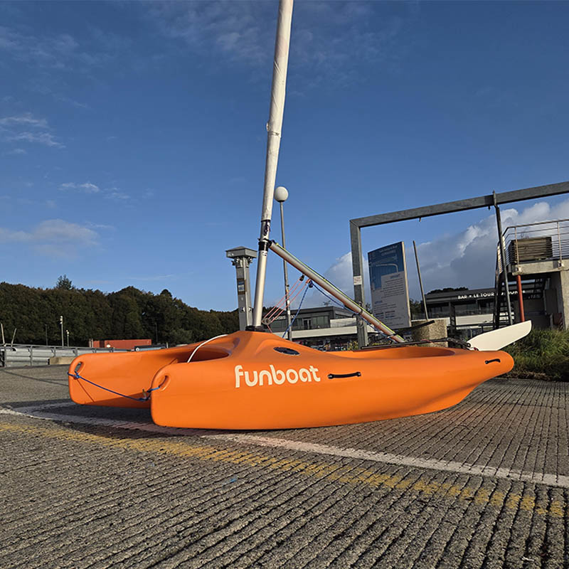 Véritable voilier de loisir, le Funboat est la plateforme idéale pour les non-marins qui souhaitent rapidement se mettre à la voile et profiter de la vie sur l'eau. Coque rotomoulée, facile à gréer, facile à naviguer, alliant habitabilité, stabilité, maniabilité et simplicité, le Funboat est extrêmement marin. Conçu avec une coque tunnel modifiée, le Funboat a tout pour quelqu'un qui veut juste s'amuser sur l'eau. Pas de dérive signifie pas de soucis pour pousser ou retourner à votre plage préférée. Il suffit de sauter dessus, de hisser la voile et c'est parti !