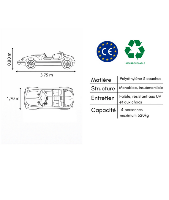 Avec ses dimensions généreuses de 3,75 m de longueur, 1,70 m de largeur et une hauteur d’environ 0,80 m, le pédalo New Beetle offre un espace confortable parfaitement adapté à une utilisation familiale ou touristique. Son format équilibré permet aux passagers de profiter d’une navigation stable, agréable et sécurisée, tout en conservant une excellente maniabilité pour les exploitants.
