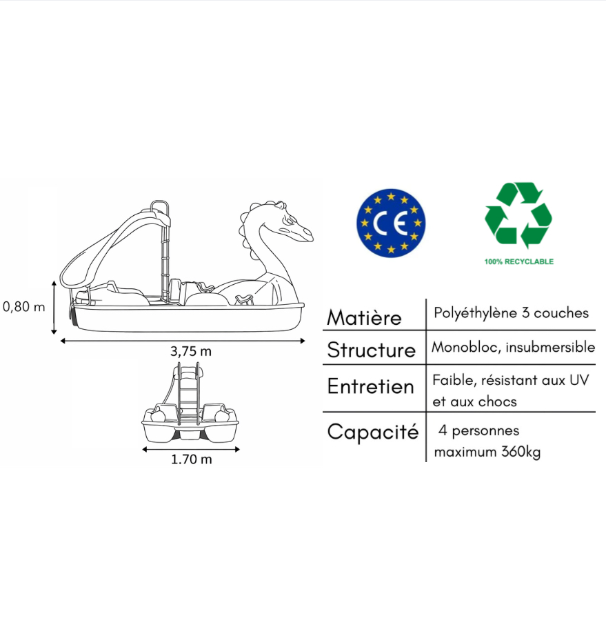Avec une capacité de 4 personnes et des dimensions de 3,75 m x 1,70 m x 0,80 m, il assure confort et performance, faisant de lui un choix idéal pour les centres nautiques, bases de loisirs et exploitants de location souhaitant proposer une activité fiable, durable et très attractive.