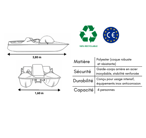 Le pédalo Classic de Samar est un bateau à pédales quatre places conçu en polyester durable, résistant aux intempéries et aux UV. Il se positionne comme un modèle fiable et polyvalent, adapté à la fois à un usage privé (balades en famille) et à la location lors d’activités nautiques récréatives. Il se caractérise par une structure robuste, un confort d’assise optimisé, des éléments en acier inoxydable pour la sécurité, et une capacité totale d’environ 4 personnes. Sa conception vise une conduite fluide et stable, même dans des conditions d’utilisation intensives.