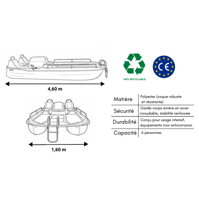 Le Sun Ferry de chez SAMAR est un pédalo spacieux conçu pour accueillir jusqu’à 6 personnes (environ 650 kg de charge). Avec sa grande plateforme stable, il est particulièrement adapté aux bases de loisirs et à la location. Fabriqué en polyéthylène robuste, il offre une excellente résistance à l’usure et aux conditions nautiques, tout en restant maniable et confortable pour des sorties en groupe sur des plans d’eau calmes.
