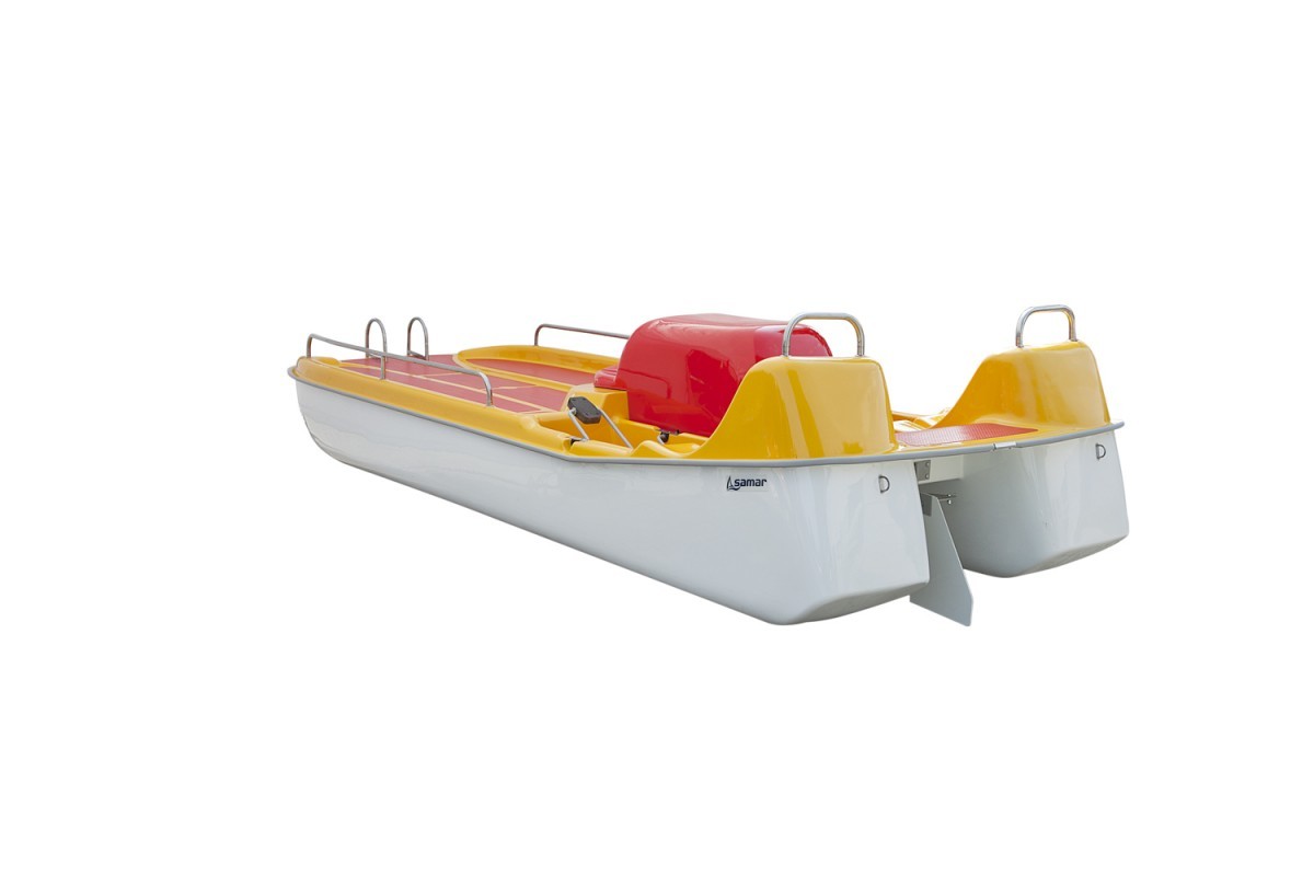 Le pédalo Sun Ferry de SAMAR est un modèle de pédalo conçu pour les activités loisirs nautiques en extérieur, particulièrement adapté aux bases de loisirs, centres de location et zones de baignade calmes. Il se distingue par une plate-forme spacieuse et une capacité d’accueil généreuse, permettant de transporter jusqu’à 6 personnes pour une charge maximale d’environ 650 kg.