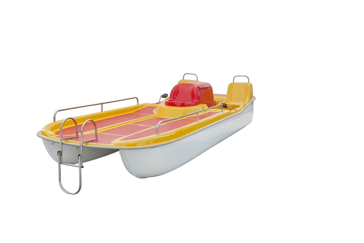 La conception repose sur une plate-forme stable et équilibrée, offrant une bonne flottaison et une assise confortable pour plusieurs utilisateurs. La propulsion s’effectue par un mécanisme de pédalier à transmission efficace, qui permet une navigation fluide et une direction réactive même en présence de vent léger ou de faibles courants.