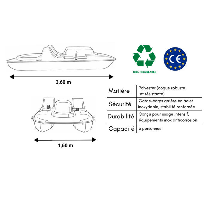 Avec une longueur d’environ 3,60 mètres et une largeur proche de 1,60 mètre, il présente un bon compromis entre compacité et stabilité transversale. Sa capacité maximale avoisine 350 kg, permettant l’embarquement de deux adultes et d’un enfant dans des conditions conformes à son dimensionnement.